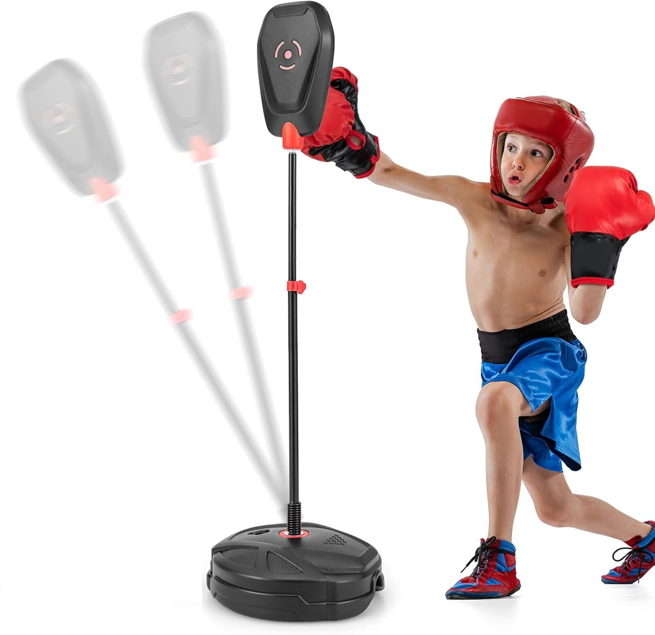 Головним елементом набору є зручні боксерські рукавиці, виготовлені з м’якого та безпечного матеріалу, що забезпечує комфортну посадку на дитячих руках. Завдяки регульованим ременям рукавиці легко підлаштовуються під різний вік та розмір дитини. У комплект також входить боксерська груша на стійці з міцною платформою - саме вона допомагає малюкам відпрацьовувати точність ударів, тренувати координацію та силу. Висоту стійки можна регулювати, підлаштовуючи її під зріст дитини, що робить тренування максимально зручними та ефективними.